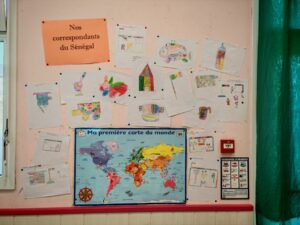 Voici notre mur « Ouverture sur le monde » avec les dessins de nos correspondants du Sénégal que nous avions rapportés lors de notre voyage en février dernier.