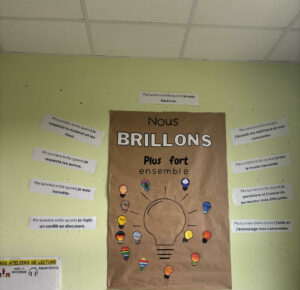 Dans un premier temps, chacun a colorié une ampoule et a réfléchi à la manière dont il pouvait faire briller la classe. Dans un second temps, les élèves ont discuté des conditions nécessaires pour bien travailler ensemble et se sentir bien dans la classe . Voici les neuf conditions retenues qui permettent de briller plus fort ensemble :