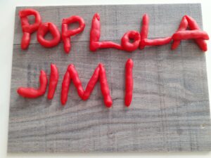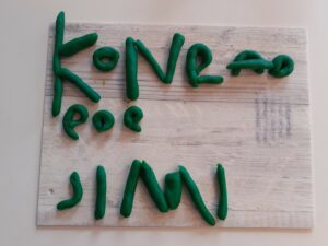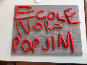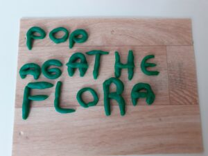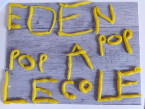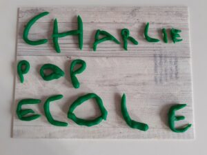 Les GS ont « écrit » leur prénom et des mots en lien avec l’album étudié. Pour cela ils ont fait des colombins en pâte à modeler.