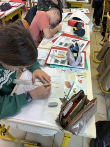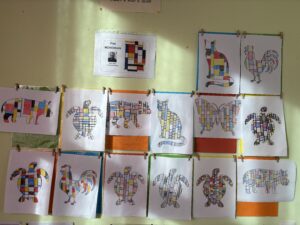 Nous avons réinvesti en art visuel ce que nous avons appris sur les droites perpendiculaires en réalisant une œuvre à la manière de l’artiste Piet MONDRIAN.