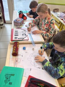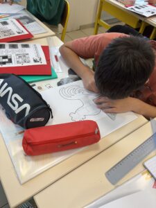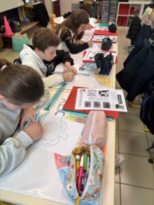 Nous avons réinvesti en art visuel ce que nous avons appris sur les droites perpendiculaires en réalisant une œuvre à la manière de l’artiste Piet MONDRIAN.