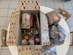 Les CM1-CM2 ont réalisé le calendrier de l’Avent de la classe en fabriquant un cadeau fait maison. Tous les jours, un enfant pioche un numéro et découvre le cadeau d’un camarade. Pour l’instant, nous avons découvert une cabane à oiseaux construite avec des bouchons, une boule à neige, des savons, un dessous de verre en forme de pain d’épice, des décorations de Noël…