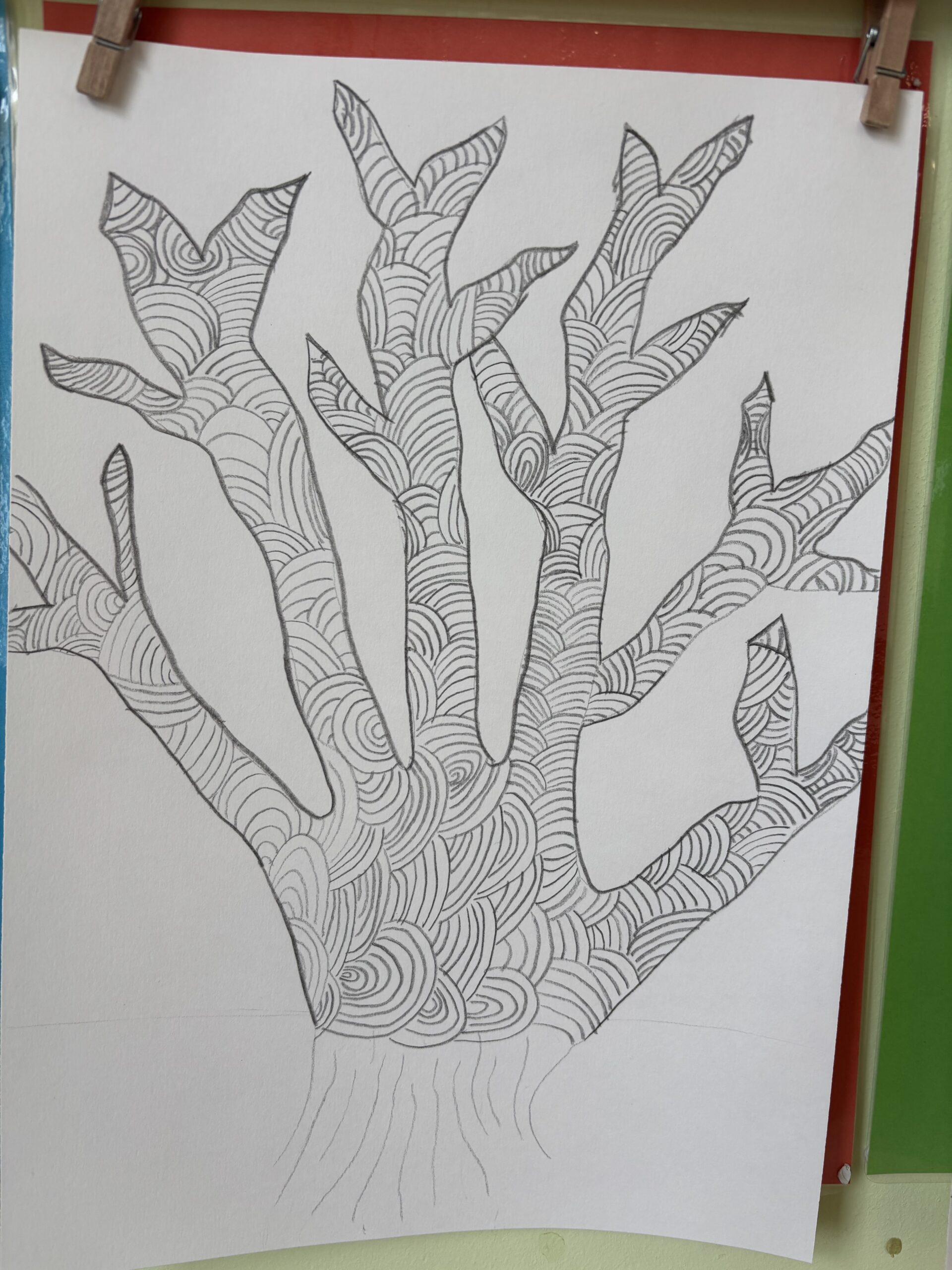 En arts visuels, nous avons dessiné un arbre fantastique à partir du contour de notre main.